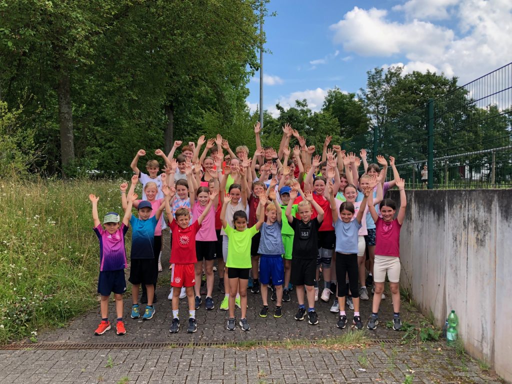 Nach dem Aufwärmen wurden alle Kinder und Jugendlichen der beiden Leichtathletik-Gruppen in sechs Teams aufgeteilt.