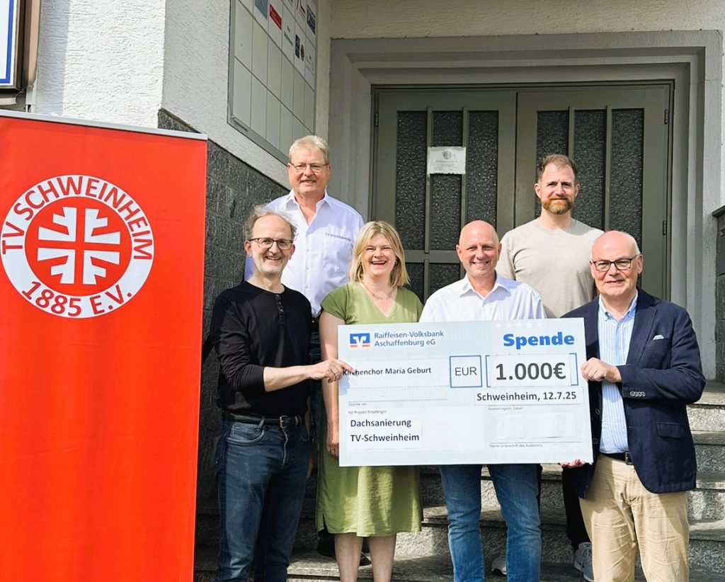 Der TV Schweinheim 1885 e.V. freut sich über die Unterstützung einer großzügigen Spende, die das Ziel der notwendigen Finanzierung der Dachsanierung wieder ein Stück näher rückt. Der Kirchenchor Maria Geburt hat den Reinerlös seines festlichen Konzerts am 18. Mai 2025 – mit dem Dettinger Te Deum und der Widor-Messe für zwei Chöre und zwei Orgeln – in Höhe von 1.000 € an den TV Schweinheim gespendet. Der Betrag fließt in die Sanierung des Turnhallendachs.
