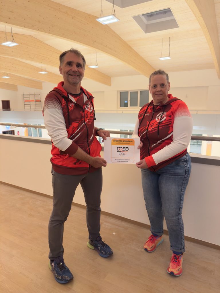 Prävention und Gesundheitsförderung gewinnen in unserer Gesellschaft zunehmend an Bedeutung. Umso erfreulicher ist es, dass der TV Schweinheim künftig offiziell das Qualitätssiegel „SPORT PRO GESUNDHEIT“ tragen darf. Grundlage dafür ist die erfolgreiche Zertifizierung von Marion Rütten und Christian Bergmann, welche sich zu Präventionstrainern weitergebildet haben.