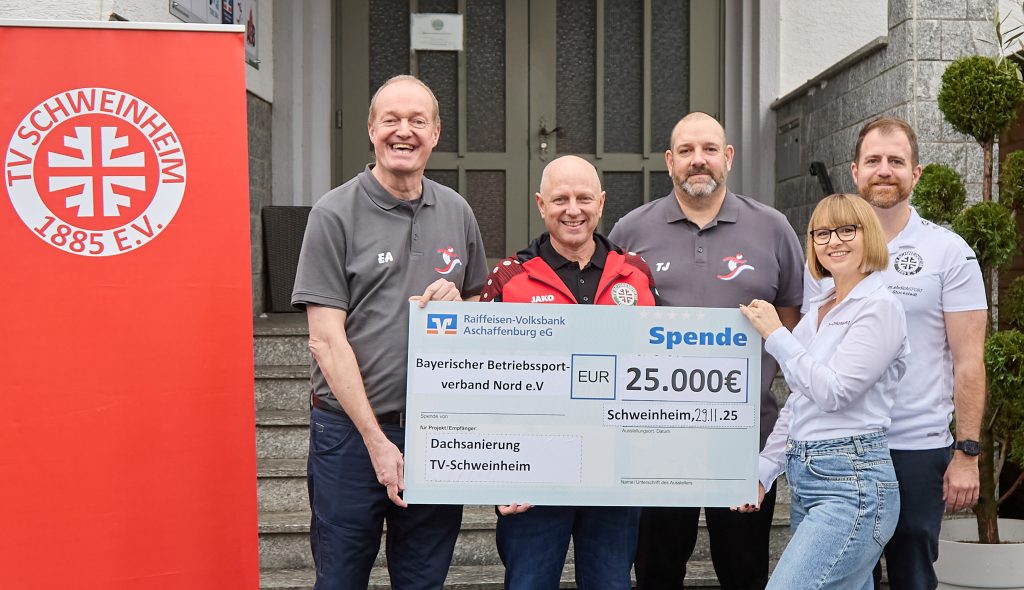 Große Freude beim TV Schweinheim: Der Bayerische Betriebssportverband Nord unterstützt die Sanierung der „Alten Turnhalle“ mit einer Spende in Höhe von 25.000 Euro. Ein starkes Signal für den Verein und für den Stellenwert von Sport, Gemeinschaft und Ehrenamt. „Diese Spende ist ein echter Meilenstein für unser Projekt. Sie zeigt, dass der TV Schweinheim weit über den Stadtteil hinaus Rückhalt erfährt“, betont Eric Leiderer, Vorstand des TV Schweinheim. „25.000 Euro helfen ganz konkret, die enorme finanzielle Belastung der Hallensanierung zu stemmen.“ Thomas Jungheim vom Bayerischen Betriebssportverband Nord unterstreicht die Bedeutung des Engagements: „Sport verbindet Menschen – im Betrieb wie im Verein. Mit unserer Spende möchten wir dazu beitragen, dass dieser wichtige Ort für Bewegung und Gemeinschaft erhalten bleibt.“ Der TV Schweinheim bedankt sich herzlich für diese außergewöhnliche Unterstützung. Ein herzlicher Dank gilt außerdem der Druckerei Tübel, die den TV Schweinheim bei der Öffentlichkeitsarbeit erneut unterstützt hat.