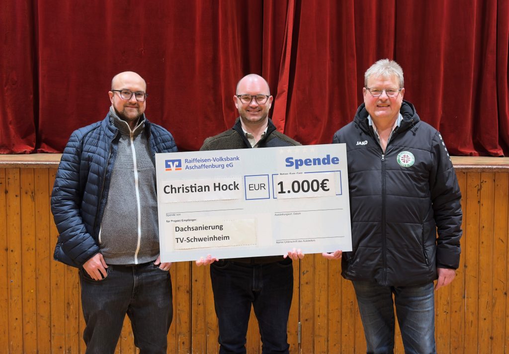 Über eine großzügige Spende durfte sich der Turnverein Schweinheim in dieser Woche freuen: Christian Hock unterstützte den Erhalt der alten Turnhalle mit einem Betrag von 1.000 Euro. Die Spende wurde im Rahmen einer persönlichen Übergabe offiziell überreicht.