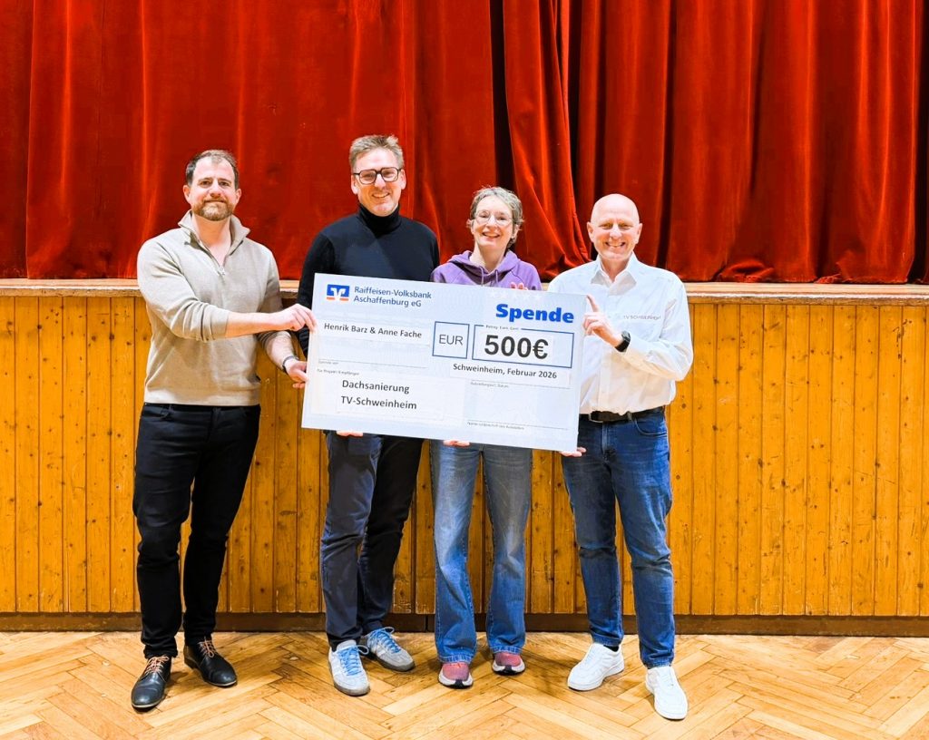 Der TV Schweinheim freut sich über eine Spende in Höhe von 500 Euro von Henrik Barz und Anne Fache zur Unterstützung der Dachsanierung der Alten Turnhalle. Beide verbinden mit der Halle mehr als nur Sport: Henrik Barz hebt hervor, wie viel hier mit Kindern gemacht wird – und dass die Turnhalle bis heute generationenübergreifend wirkt. Für Anne Fache ist sie ein fester Bestandteil des öffentlichen Lebens in Schweinheim: ein Treffpunkt, an dem Sport und Gemeinschaft zusammenkommen und der Stadtteil zusammenrückt.